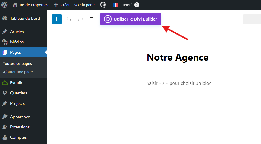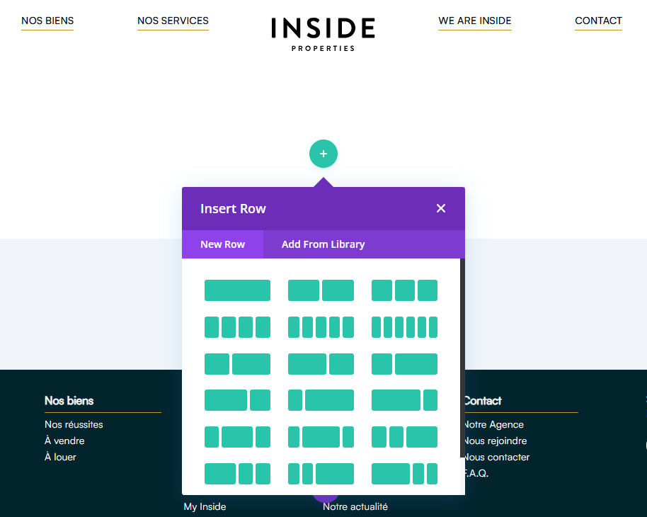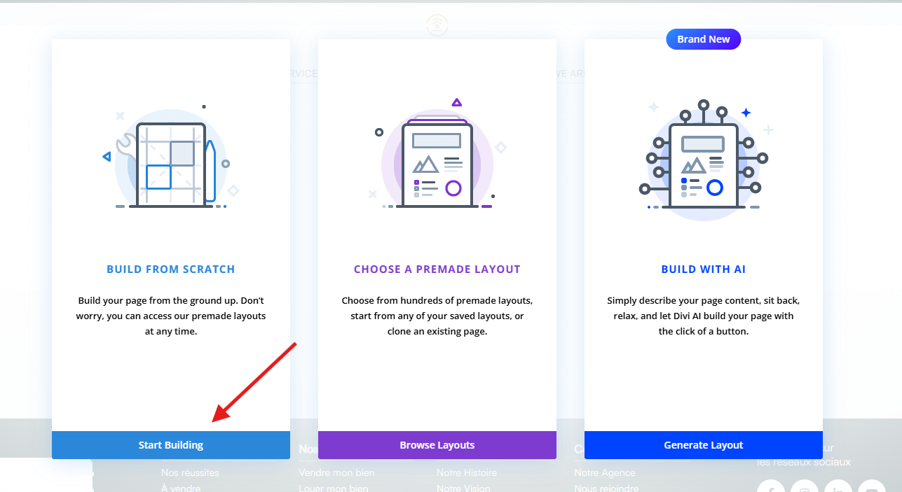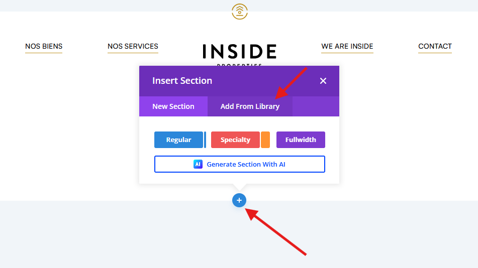 Pour convertir une page standard en page Divi (pour édition visuelle), cliquez ici.Puis, cliquez ici pour entrer dans l'éditeur visuel Divi.Il va vous proposer ces 3 choix. Choisir le premier.Il va vous proposer d'ajouter une rangée dans une section déjà insérée par défaut par Divi, mais nous ce qu'on veut c'est ajouter une de nos sections prédéfinie (widgets). Donc on va fermer cette fenêtre "Insert row".À la place, on va ajouter une nouvelle section (en cliquant sur le ), ce qui va nous permettre d'en choisir une prédéfinie via l'onglet "Add from library".Choisir ici le widget à insérer, et cliquer sur "Use this Section"Enfin, ne pas oublier de supprimer la section vide inséré par défaut par Divi.